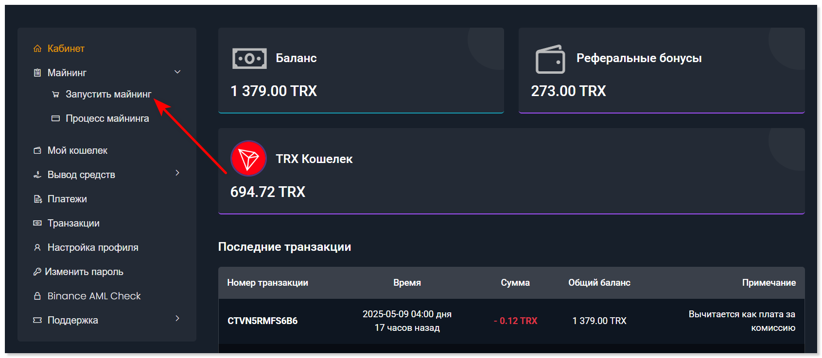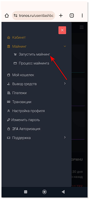 Заходим в личный кабинет через смартфон, и кликаем на вкладку «Запустить майнинг»
