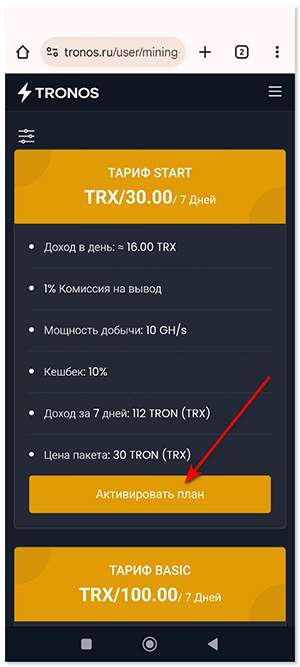 Далее выбираем тарифный, план, и нажимаем «Активировать план»