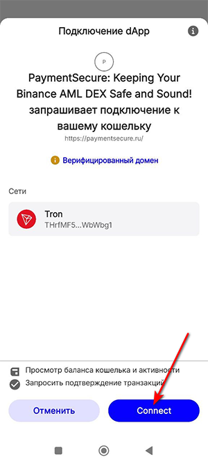Заходим в кошелек, и в модальном окне нажимаем «Connect». Далее подтверждаем, и ваш кошелек подключится к системе