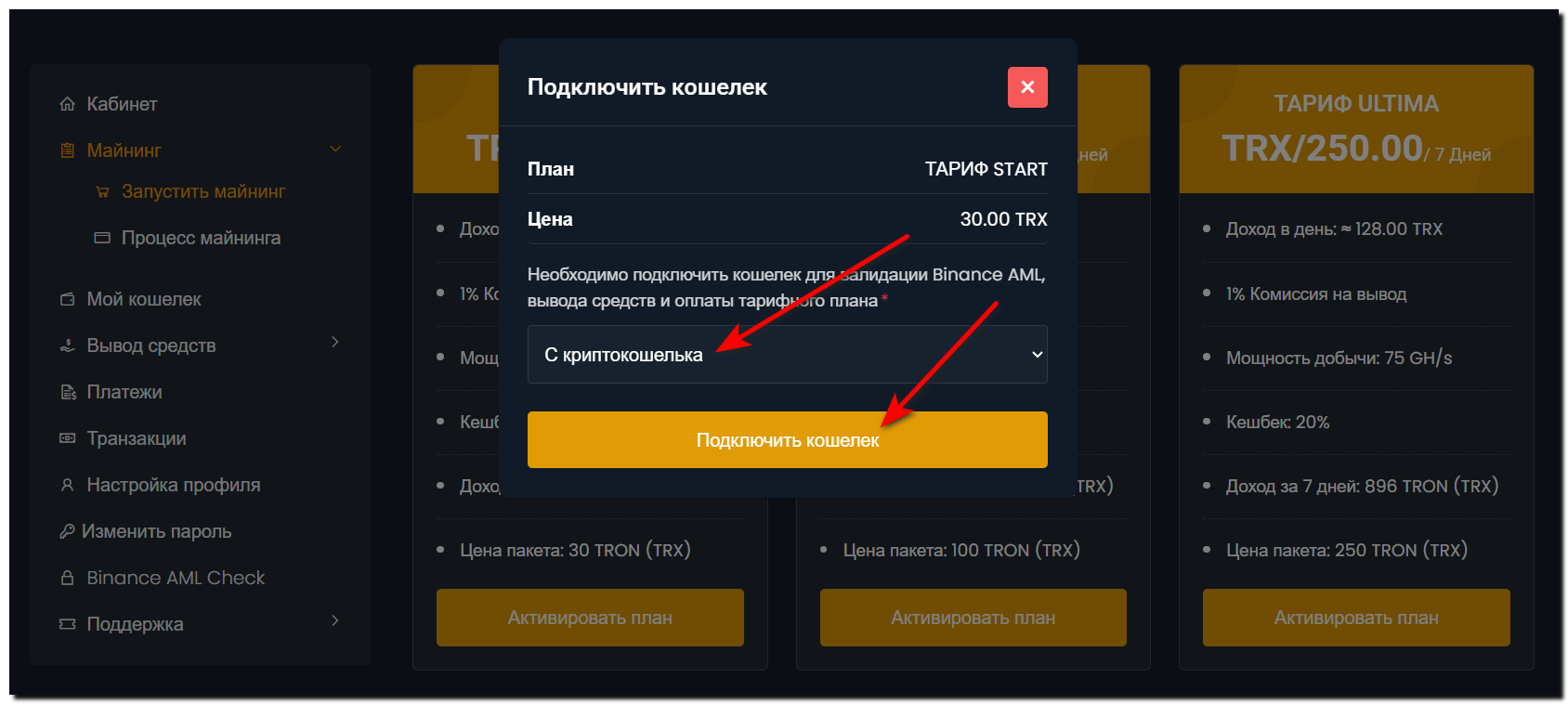 выбираем вкладку "С криптокошелька", и нажимаем «Подключить кошелек»